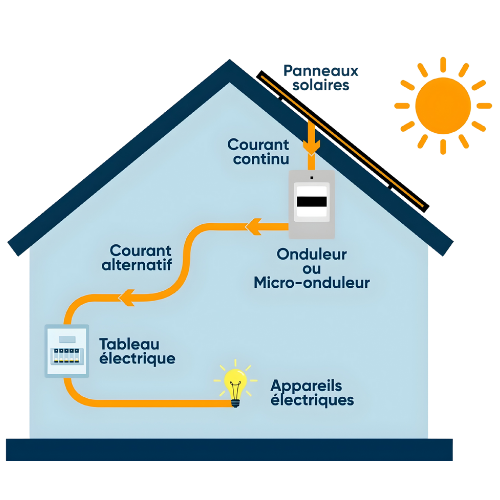 Une installation solaire fonctionne grâce à des panneaux photovoltaïques, composés de cellules en silicium qui captent la lumière du soleil pour la transformer en courant continu. Ce courant est ensuite envoyé vers un micro-onduleur, positionné en-dessous de chaque panneau, qui le convertit en courant alternatif compatible avec les appareils électriques de la maison. Lorsque la production dépasse la consommation, l’énergie peut être :