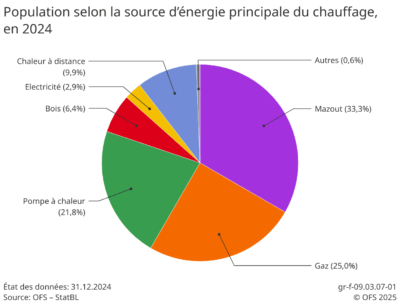 En matière de ménages, 60% des foyers suisses se chauffaient aux énergies fossiles (35% au mazout et 25% au gaz) en 2024. La part des ménages se chauffant avec une pompe à chaleur était de 20%.