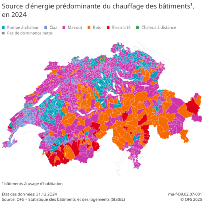 Les chiffres viennent de sortir. L’Office Fédéral de la Statistique (OFS) a publié le 22 septembre dernier les Statistiques 2024 des bâtiments et des logements. Retenons que 35% des bâtiments étaient chauffés au mazout et 17% au gaz. Un peu plus du quart des maisons individuelles (28%) et un ménage sur cinq (20%) étaient équipés d’une pompe à chaleur en 2024. Les énergies fossiles perdent donc peu à peu du terrain mais les sources d’énergies vertes jouissent encore d’un potentiel largement sous-exploité. Explications.
